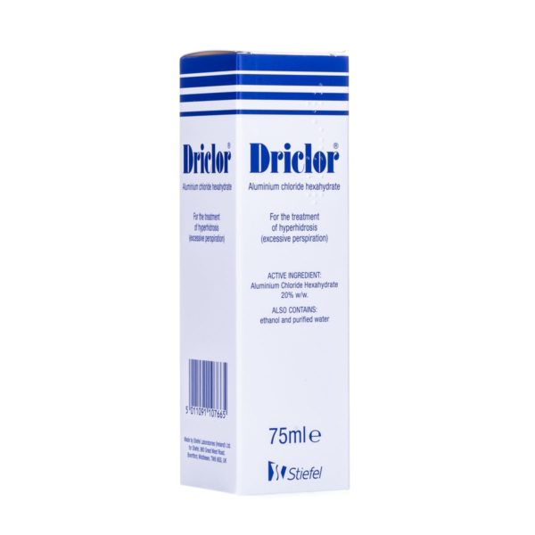 Driclor Roll-on Solution contains a medicine called aluminium chloride. This works as a strong anti-perspirant used in the treatment of hyperhidrosis (excessive sweating) affecting the armpits, feet and hands.